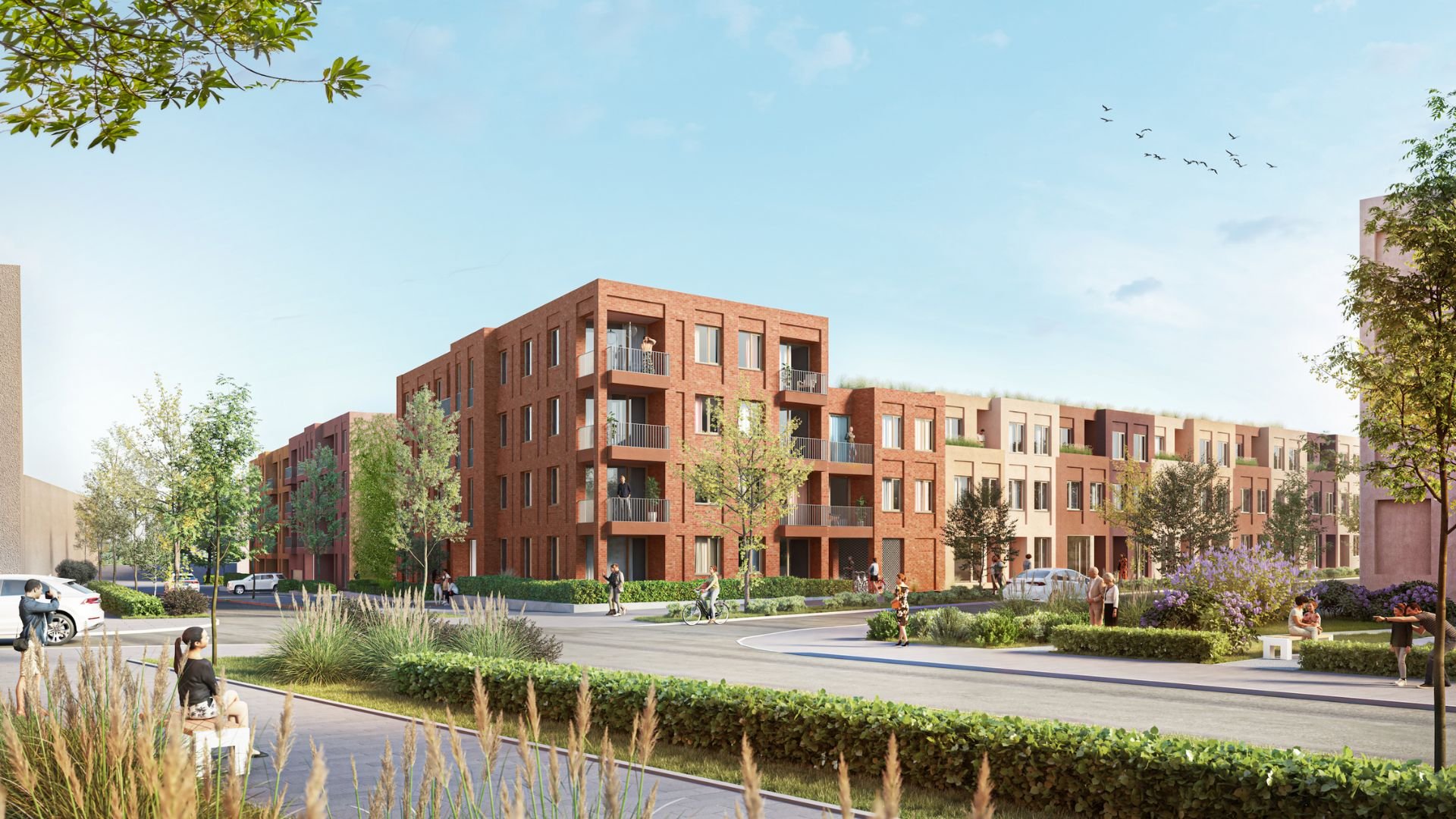 We prioritize ecological diversity, green facades, photovoltaic installations, and green roofs. Ground-floor apartments offer private front gardens, while rear gardens are organically designed and protected. But that’s not all! We think practically and incorporate bicycle parking, waste disposal areas, and a car-sharing point. The green centre is accessible and invites people to meet, play, and relax. We are designing for the future and utilizing greenery and rainwater management for a nature-inspired microclimate regulation. Together, we are creating a sustainable and livable environment!