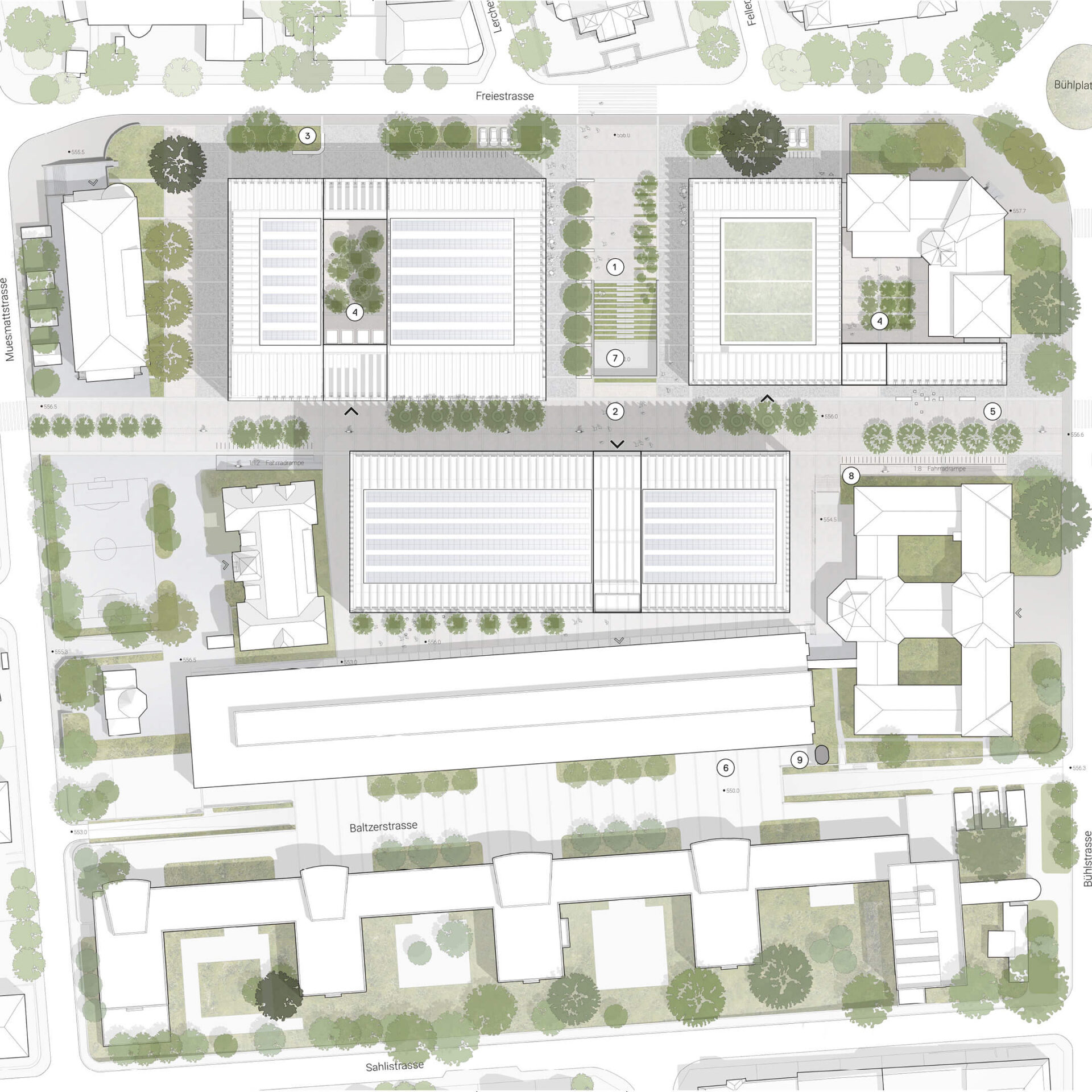 The new outdoor facilities of the Muesmatt Campus itself consist of three main elements: A linear and “green frame” that runs around the site and mediates towards the adjacent neighbourhood; a green axis as the backbone of the open space system, along which the buildings of phases 1 and 2 and the most important open spaces are arranged and which simultaneously serves as a mobility axis and a dynamic place to stay; finally, a large campus square that accommodates various neighbourhood- and city-related functions as a pole of identity.