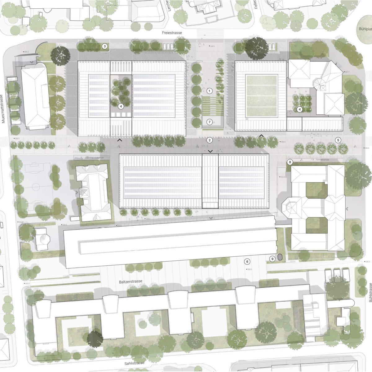 The campus is located in the Muesmatt district, northwest of Bern’s old town. The area underwent progressive development in the 20th century, leading to a fragmentation of its natural elements. Today, the neighbourhood consists of individual buildings set back from the street frontage and extensive open spaces and private gardens.